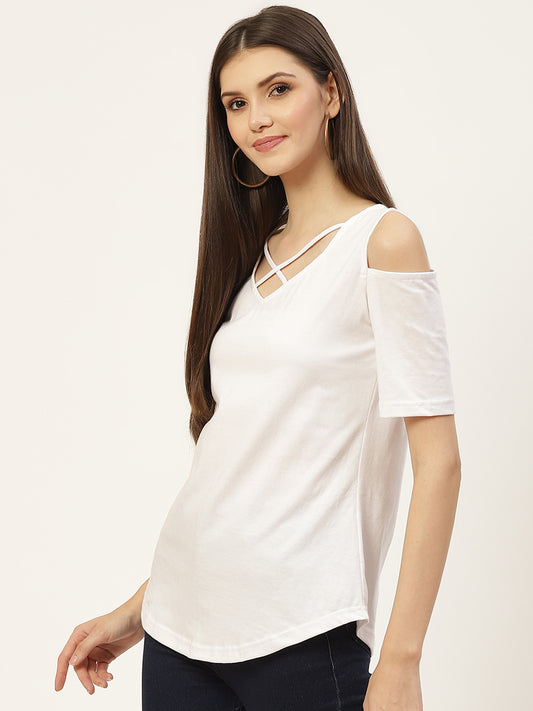 Women Cotton Solid Cold-Shoulder Sleeves Top